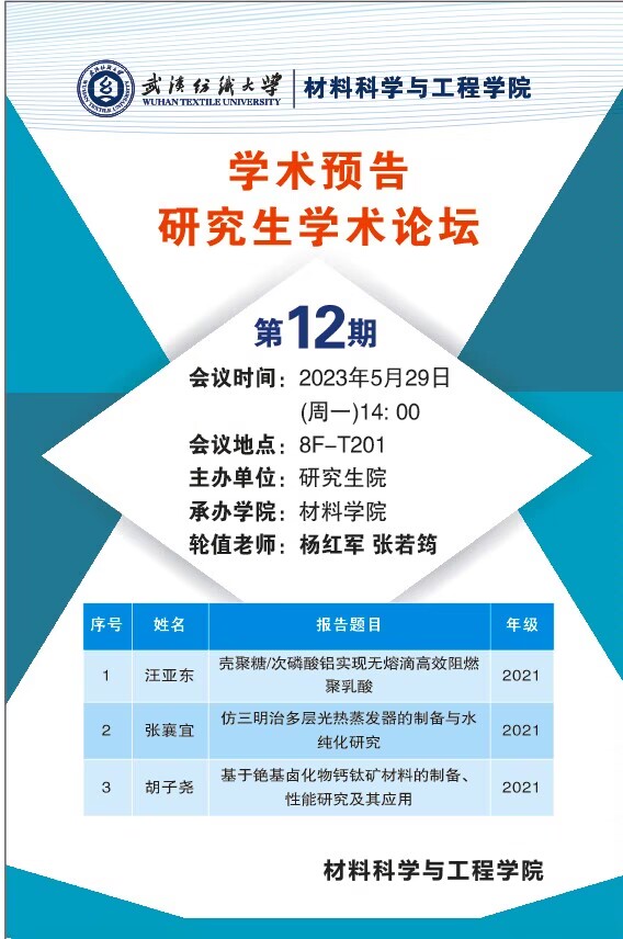 学术预告:第306期研究生学术论坛暨材料科学与工程学院2023年第12期研究生学术论坛